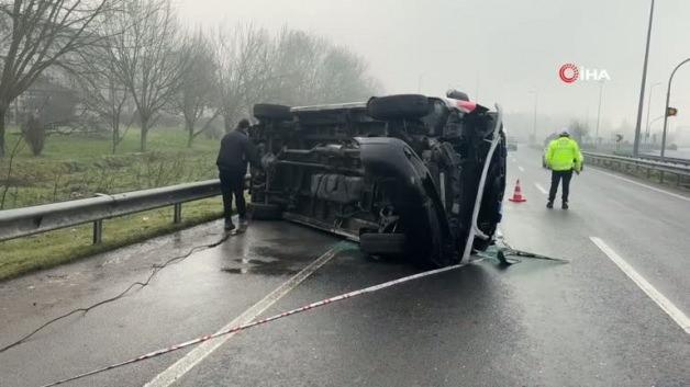 Düzce'de sabah saatlerinde kuzey çevre yolunda kaza meydana geldi. C.T. idaresindeki özel bir hastaneye ait ambulans yoğun sis nedeniyle sürücüsünün direksiyon kontrolünü kaybetmesi sonucu bariyerlere çarparak devrildi.
