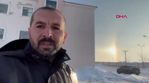 Bingöl'ün Karlıova ilçesinde, havadaki buz kristallerinin güneş ışığını kırıp yansıtmasıyla oluşan ve 'yalancı güneş' olarak bilinen atmosfer olayı, cep telefonu kamerasıyla görüntülendi.