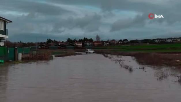 Edirne'de etkili olan sağanak yağmurun ardından lüks villaların bulunduğu bölgede su baskını yaşandı. Villalara giden yol sular altında kaldı.