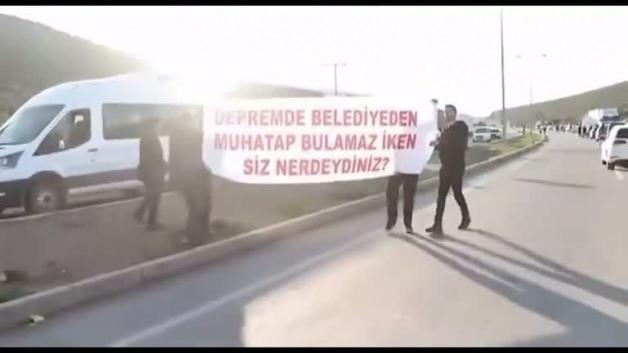 Açılan pankartlarda, "Enkazdan daha ağır olan depremden bugüne CHP'nin yokluğudur" ve "Hatay oy verdi CHP sırtını döndü" ifadeleri yer aldı.