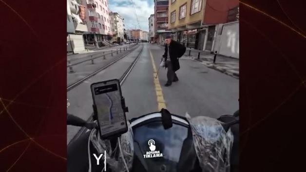 İstanbul'da tramvay yolunda yürüyen ve arkasından gelen aracı fark etmeyen işitme engelli yaşlı adam, motosikletli kuryelerin dikkati sayesinde mutlak bir kazadan döndü.