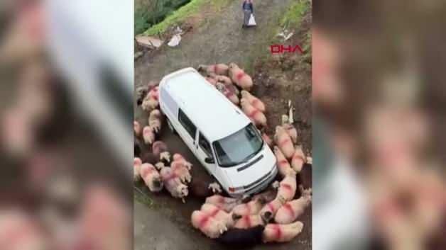 Trabzon'un Araklı ilçesinde ahırdan çıkarılan koyunların park halindeki minibüsün etrafında halka oluşturarak dönmesi ilginç görüntüler oluşturdu. Sürünün dakikalarca aracın çevresinde döndüğü anlar, cep telefonuyla görüntülendi.