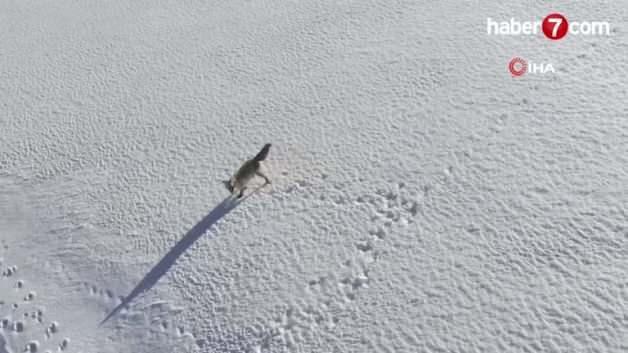 Bitlis'in Adilcevaz ilçesinde karla kaplanan doğada ilerleyen tilkinin drona yansıyan görüntüsü izleyenleri mest etti.