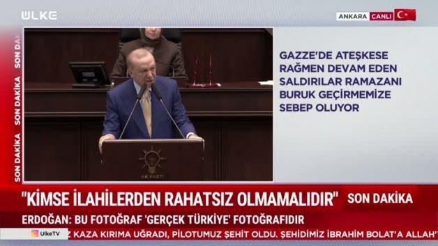 Erdoğan kürsüden muhalefete yüklendi ve bu tüm Türkiye'nin aynı ritimde buluşması özlediğimiz, arzuladığımız bir iklimdi. Kimse bundan gocunmamalı diyerek "Hayırdır, çocuklarımızın namazı orucu öğrenecek olması sizi neden rahatsız ediyor" diyerek Ramazan süslemelerinin yapılmasına tepki gösteren ve bunun Laiklik ilkesine ayrı olduğunu iddia eden muhalefe sert sözlerle yüklendi.