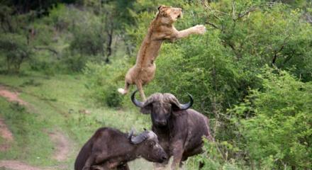 Güney Afrika'da bufalolar, avlanma derdinde olan bir aslana öyle bir saldırdı ki. Aslan metrelerce öteye fırladı. İşte o görüntüler..
