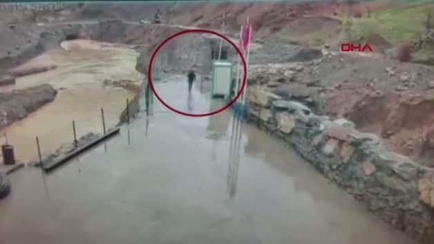 Uludere ilçesine bağlı Taşdelen köyünde etkili olan sağanak yağışın ardından bölgede sel ve heyelanlar yaşandı. Sel sularının hızla köy içine doğru ilerlediği sırada inşaat şantiyesinde çalışan güvenlik görevlisi, suyun geldiğini fark ederek bulunduğu noktadan hızla koşarak uzaklaştı. O anlar, güvenlik kamerasına yansıdı.