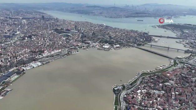 İstanbul`da etkili olan sağanak yağış sonrası dereler ve kanalizasyonlardan gelen çamurlu su, Haliç ile buluşmasıyla suyun rengi kahverengiye dönüştü. Çamura bulanan Haliç havadan görüntülendi.
