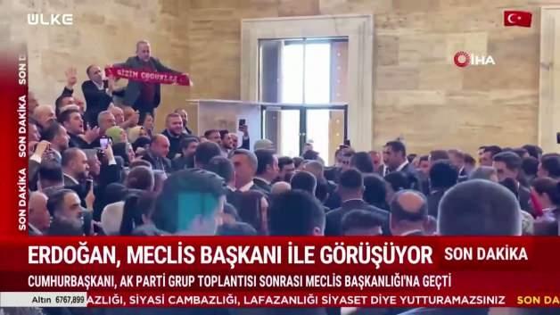 AK Parti Grup Toplantısı sonrası Meclis Başkanlığı'na geçen Cumhurbaşkanı Erdoğan, burada TBMM Başkanı Numan Kurtulmuş ile görüşüyor.