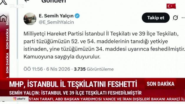 MHP Genel Başkan Yardımcısı Semih Yalçın, İstanbul İl Teşkilatı ve 39 ilçe teşkilatının feshedildiğini duyurdu.