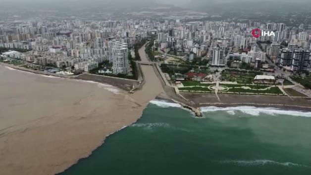 Mersin'in yaylarında etkili olan yağışlarla oluşan sel suları dereleri coşturarak Akdeniz'le buluştuğu bölgeyi de çamur rengine bürüdü. Derelerden akan sel suları ile denizin buluşması ise dron ile görüntülendi.
