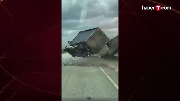 Görüntülerde, şiddetli rüzgarın önce kamyonun arkasındaki kapalı kasa römorku sağ tekerlekleri üzerinden havaya kaldırdığı, ardından römorkun şiddetle parçalanarak otoyolun sağındaki şarampole uçtuğu görülüyor. Römorkun kopmasıyla dengesi tamamen bozulan ana araç ise saniyeler içinde sağ tarafının üzerine devrilerek asfalt zemin üzerinde metrelerce sürükleniyor ve toz bulutu kaldırıyor. Olayı anbean kaydeden takipteki aracın içindeki yolcuların panik halinde Rusça durması için sürücüyü uyardığı anlar da kayıtlara yansıdı.