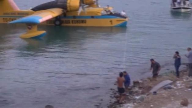 Tekne ile bulunduğu bölgeden Güvercinlik Koyu’na çekilen yangın uçağı vatandaşların yardımlarıyla bir ağaca bağlandı. Uçağa bağlanan halatları çeken vatandaşlar bir süre halatı tutarak uçağın denize açılmasını engelledi. Daha sonra halatlar yardımı ile uçağı elleriyle çeken vatandaşlar karaya yakın bir bölgeye bağladı. Bazı vatandaşlar ise uçağa elleriyle yön vererek zarar görmesini engelledi. Uzun bir halata bağlanan uçak ağaca bağlanarak sabitlendi. Uçağı çalıştırmak için ise bölgeye teknik servis elemanları geldi.