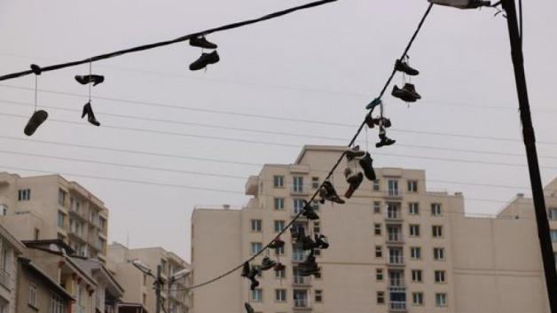 İstanbul Esenyurt'ta elektrik kablolarına asılı onlarca ayakkabı ilginç görüntüler oluşturdu