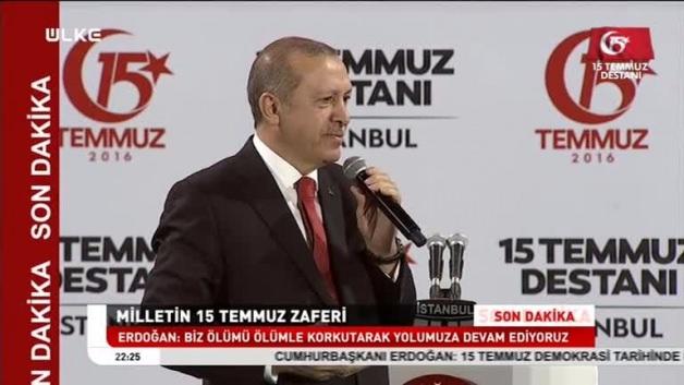 Cumhurbaşkanı Erdoğan: "Bazıları ne diyor ısrarla; kontrollü darbe. Milletimizin bu şanlı direnişine kara çalmaya çalışıyorlar. Bu terbiyesizliktir, bu ahlaksızlıktır. Doğru, doğru o gece 23.15, havalimanına iniyor, Atatürk Havalimanı ve benim İstanbul havalimanında on binlerce kardeşim orada. Tanklar VIP'nin önünde ve geliyor. Bu tanklar orada duruyor ya, dışarı çıkamıyor bu beyefendi. Önce korkuyor ve gidiyorlar görüşüyorlar. Görüşmeyi yaptıktan sonra tankların koruması altında bu Kılıçdaroğlu denilen zat oradan çıkıyor Bakırköy Belediyesi'ne gidiyor. Biz Yenikapı buluşmasına bu beyefendiyi de davet ettik. Bilseydim etmezdim. Bunları sonradan öğreniyoruz. Önce davetime olumsuz cevap verdi. Son anda cumartesi Yenikapı, cuma günü gelebileceğini bildirdiler. Fakat Yenikapı ruhundan da hiçbir şey alamamış ki ne dedi; 'kontrollü darbedir.' İnsan utanır utanır. Bu 250 şehidimize saygısızlıktır, hakarettir, 2 bin 193 gazimize saygısızlıktır, hakarettir, bu millete saygısızlıktır, hakarettir. Bunu nasıl söylüyorsun. Bu millet senin gibi ürkek, korkak değil, bu milletin yüreği var yüreği. O yürek sende yok. Bu mücadele ödleklerin mücadelesi değildir, vandalların mücadelesi değildir."